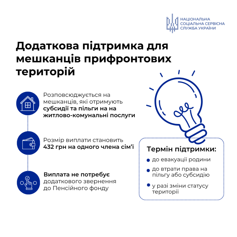 Отримувачами виплати є особи, які оформили пільги та субсидії на житлово-комунальні послуги. Розмір виплат становить 432 грн на одного члена сім’ї та максимально 1 296 грн на домогосподарство.